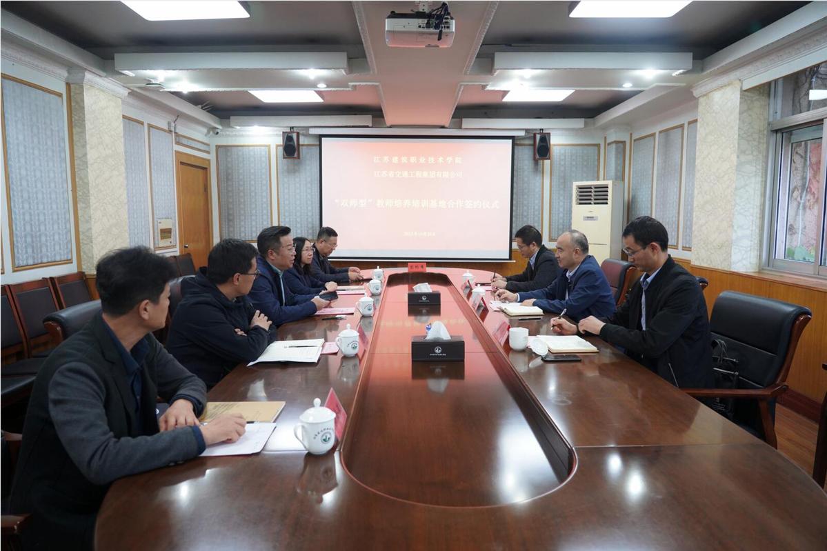 10月26日下午,我校与江苏省交通工程集团有限公司“双师型”教师培养培训基地合作协议签订仪式在行政楼第二会议室举行。副院长刘海波、江苏省交通工程集团有限公司副总裁王春华及校企双方相关部门负责人出席签订仪式。
