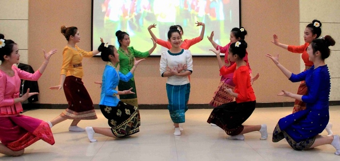 老挝留学生在排练舞蹈节目(中间穿白色上衣是美丽)