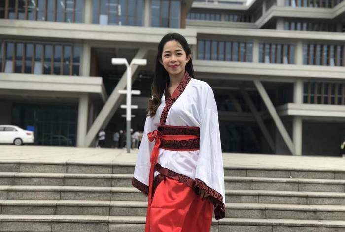 美丽穿汉服在学校图书馆前拍照留念