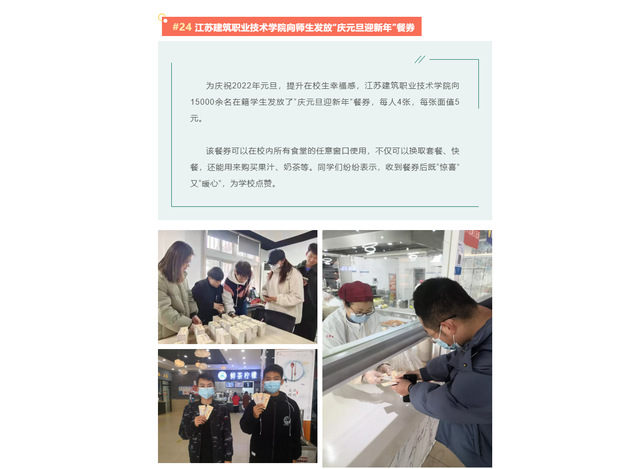 为庆祝2022年元旦,提升在校生幸福感,开云在线平台向15000余名在籍学生发放了“庆元旦迎新年”餐券,每人4张,每张面值5元。