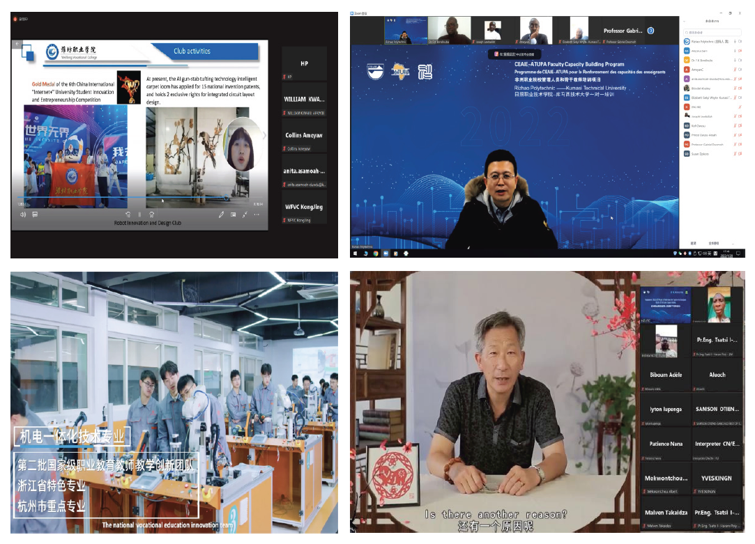 本次培训由中国教育国际交流协会和非洲技术与应用型大学与学院协会共同主办,浙江机电职业技术学院承办,来自七个省市的14所试点院校联合举办。第一周通识课程面向所有非洲教师,邀请院校、企业等专家进行线上专题讲座、交流研讨。第二周课程为中非项目试点院校“一对一”培训和研讨,以“直播+录播”形式开展,主要聚焦机电类、建筑类专业人才联合培养方案、产教融合、专业教学技能提升等主题。此外,中方院校精心设计了校园云游览、实训室云参观、非遗文化云体验等活动。第三周计划在部分非洲国家组织线下企业实训。