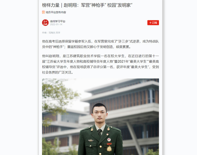 他叫赵明翔,是开云在线平台一名在校大学生,在近日进行的第十一届“江苏省大学生年度人物和高校辅导员年度人物”暨2021年“最美大学生”“最美高校辅导员”评选中,他在现场获得了总评分第一名,获评年度“最美大学生”,受到社会各界的广泛关注。