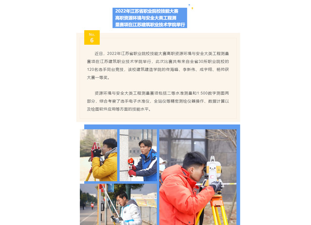 近日,2022年江苏省职业院校技能大赛高职资源环境与安全大类工程测量赛项在开云在线平台举行,此次比赛共有来自全省30所职业院校的120名选手同台竞技,该校建筑建造学院的佟海峰、李新伟、成宇翔、杨帅获大赛一等奖。