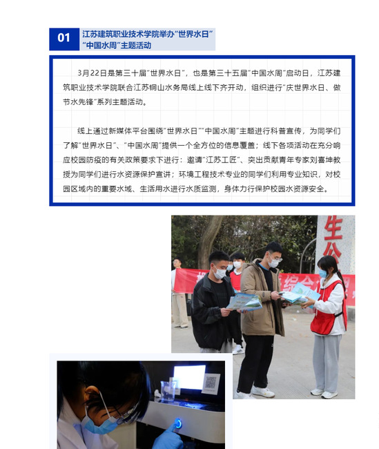 线上通过新媒体平台围绕“世界水日”“中国水周”主题进行科普宣传,为同学们了解“世界水日”、“中国水周”提供一个全方位的信息覆盖;线下各项活动在充分响应校园防疫的有关政策要求下进行:邀请“江苏工匠”、突出贡献青年专家刘喜坤教授为同学们进行水资源保护宣讲;环境工程技术专业的同学们利用专业知识,对校园区域内的重要水域、生活用水进行水质监测,身体力行保护校园水资源安全。