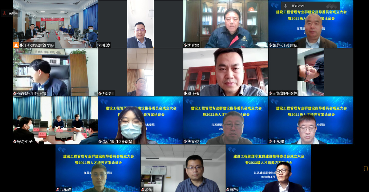 为深化产教融合,进一步加强我校建设工程管理专业群建设,4月27日,我校建设工程管理专业群建设指导委员会成立大会暨2022级人才培养方案论证会在线上召开,主会场设在建筑管理学院会议室。副院长曾凡远、校内各相关单位负责人在主会场参加会议。全国五一劳动奖章、“江苏大工匠”称号获得者、我校江苏省产业教授沈春雷,江苏博智工程咨询有限公司等5家优质合作企业负责人,建设工程管理专业群全体专任教师等通过线上方式参会。会议由建筑管理学院副院长苗磊刚主持。