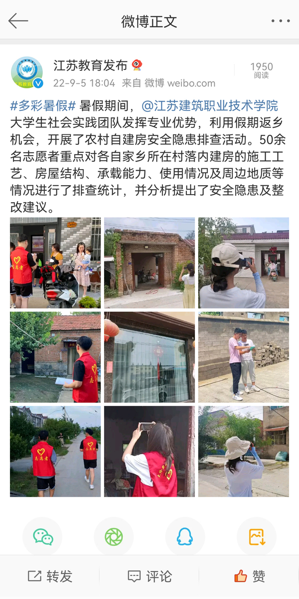 #多彩暑假# 暑假期间,@开云在线平台 大学生社会实践团队发挥专业优势,利用假期返乡机会,开展了农村自建房安全隐患排查活动。50余名志愿者重点对各自家乡所在村落内建房的施工工艺、房屋结构、承载能力、使用情况及周边地质等情况进行了排查统计,并分析提出了安全隐患及整改建议。