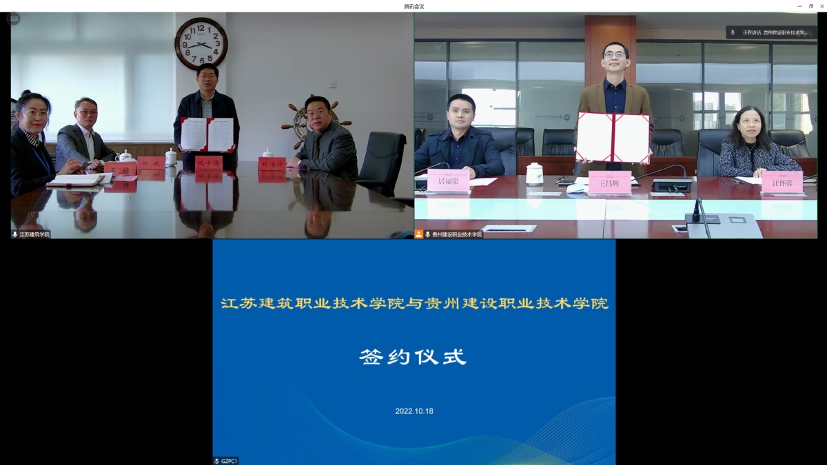 10月18日下午,我校与贵州建设职业技术学院国际化发展协作协议签署仪式通过直播连线方式在线上举行,我校会场设在行政楼第一会议室,校长沈士德、副校长刘海波,贵州建设职业技术学院校长王昌辉、副校长汪怀蓉,两校国际处负责人出席仪式。