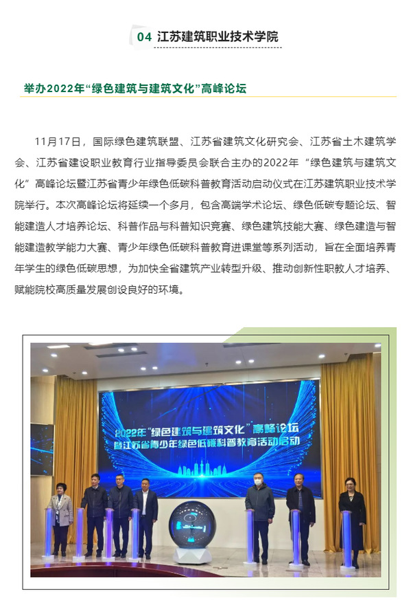11月17日,国际绿色建筑联盟、江苏省建筑文化研究会、江苏省土木建筑学会、江苏省建设职业教育行业指导委员会联合主办的2022年“绿色建筑与建筑文化”高峰论坛暨江苏省青少年绿色低碳科普教育活动启动仪式在开云在线平台举行。本次高峰论坛将延续一个多月,包含高端学术论坛、绿色低碳专题论坛、智能建造人才培养论坛、科普作品与科普知识竞赛、绿色建筑技能大赛、绿色建造与智能建造教学能力大赛、青少年绿色低碳科普教育进课堂等系列活动,旨在全面培养青年学生的绿色低碳思想,为加快全省建筑产业转型升级、推动创新性职教人才培养、赋能院校高质量发展创设良好的环境。