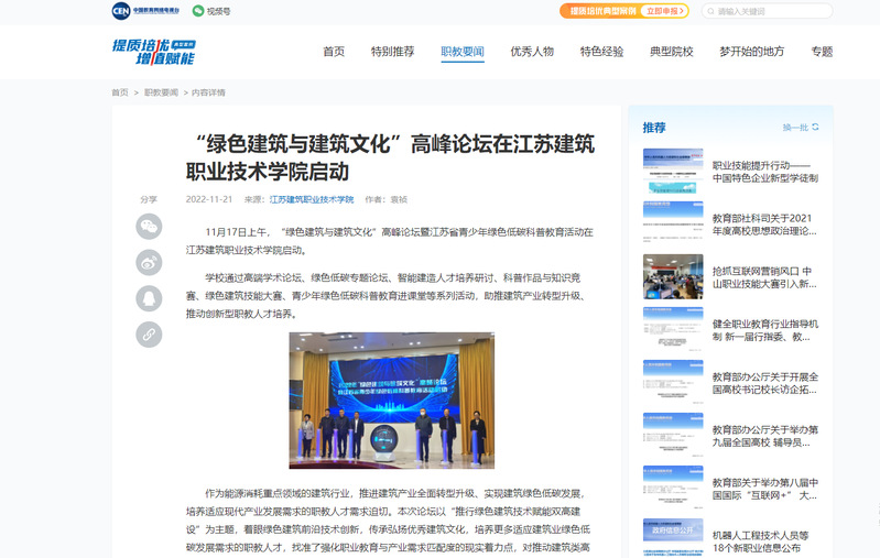 学校通过高端学术论坛、绿色低碳专题论坛、智能建造人才培养研讨、科普作品与知识竞赛、绿色建筑技能大赛、青少年绿色低碳科普教育进课堂等系列活动,助推建筑产业转型升级、推动创新型职教人才培养。