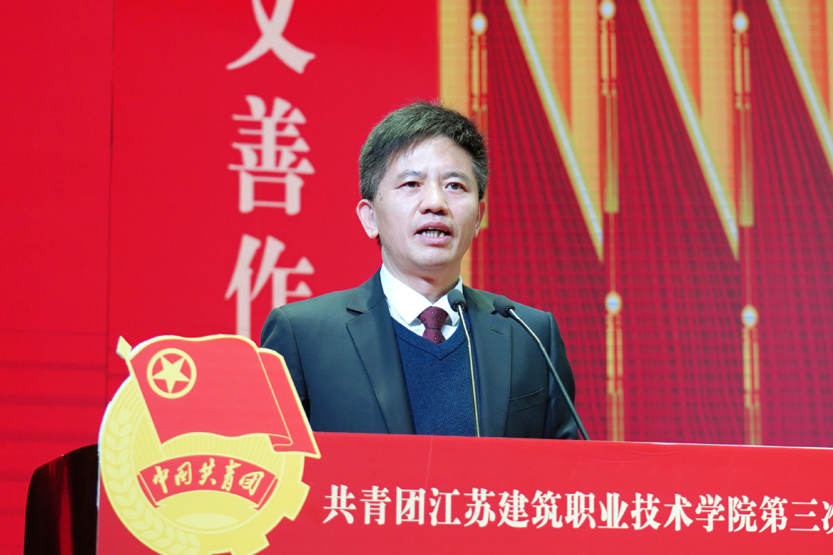 朱东风发表讲话,他在讲话中高度评价了学校第二次团代会以来,各级团组织团结带领广大团学青年为学校高质量发展作出的重要贡献,并代表学校党委祝贺大会召开。朱东风强调,青年是祖国的未来、民族的希望,每一位青年都应主动承载更为光荣的责任和使命,在实现中华民族伟大复兴中国梦和推动江苏建院创建全国一流智能建造特色鲜明的职业本科院校新征程中,迸发青春力量,展现青春价值,绽放青春光彩。他向学校广大团学青年提三点希望:一是要坚定理想信念,筑牢信仰之基,把个人的理想追求融入国家和民族事业中来,做中国特色社会主义事业的合格建设者和可靠接班人;二是要增长知识本领,投身伟大实践,真正将对人民的感情与对现实的关怀转化为加强自身学习的不竭动力,在中国大地上探寻青春的价值和人生的答案;三是要矢志拼搏奋斗,担当时代重任,立志做有理想、敢担当、能吃苦、肯奋斗的新时代好青年,让青春绽放更为绚丽的光芒。