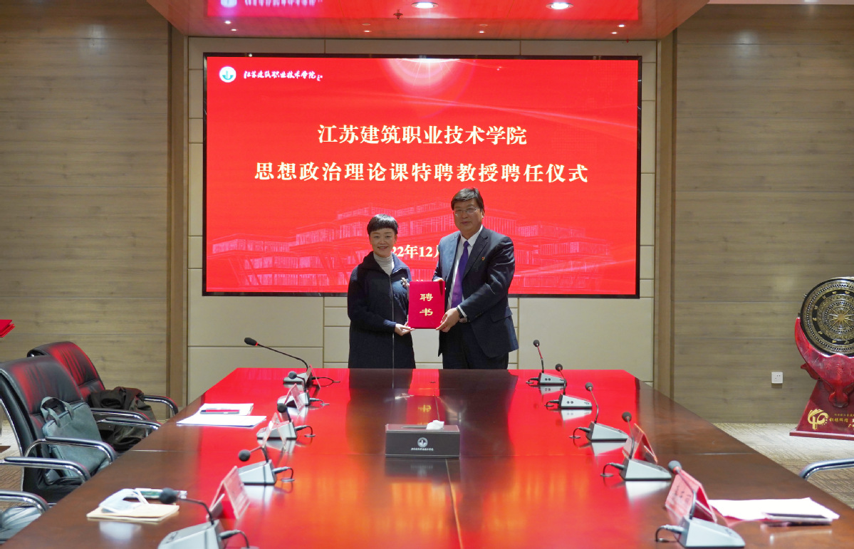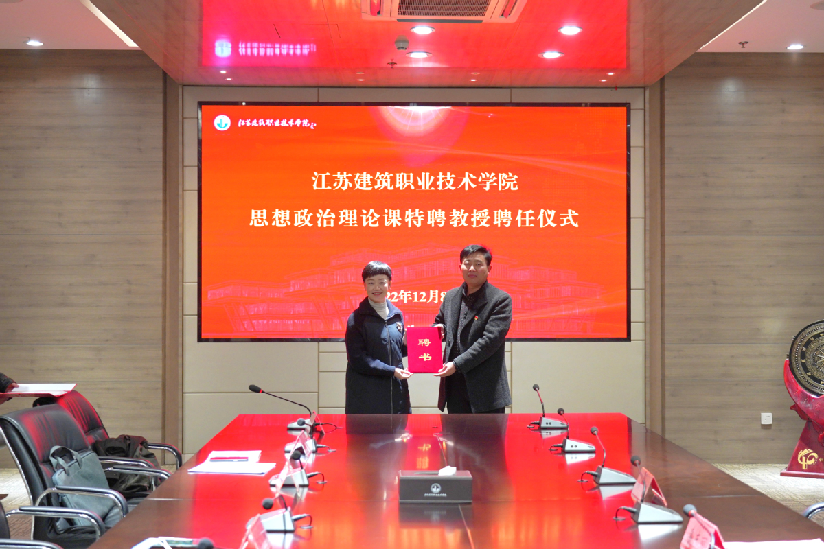 宣讲开始前,学校在图书馆第二会议室举行了思想政治理论课特聘教授聘任仪式。梁惠向夏伯党、王行辉颁发了特聘教授证书。建筑建造学院聘请两位劳模担任学生成长成才导师。