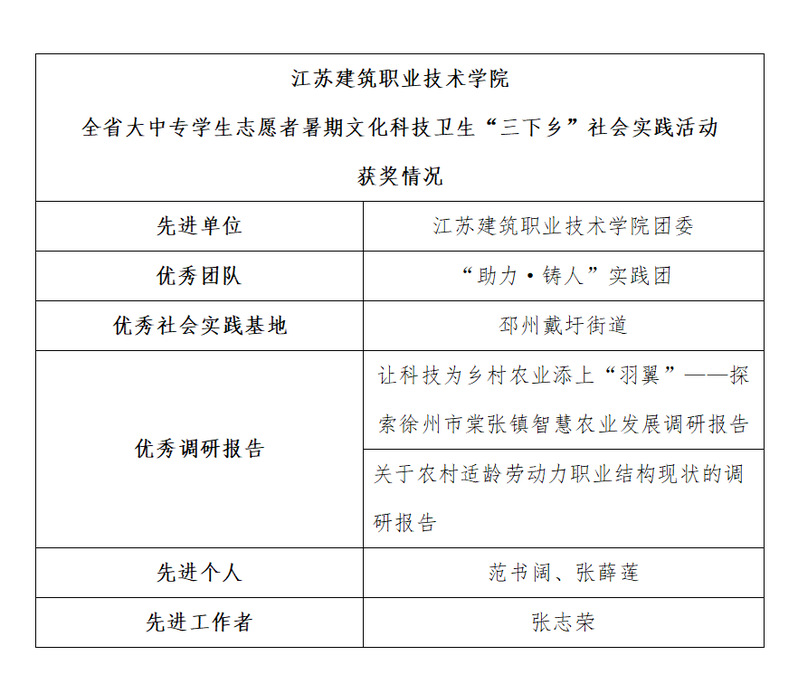 校团委获评“先进单位”,建筑装饰学院“助力·铸人”实践团获评“优秀团队”,校社会实践基地——邳州戴圩街道获评“优秀社会实践基地”,智能制造学院团队打造的《让科技为乡村农业添上“羽翼”——探索徐州市棠张镇智慧农业发展调研报告》以及建筑装饰学院团队打造的《关于农村适龄劳动力职业结构现状的调研报告》获评“优秀调研报告”,建筑装饰学院专职辅导员张志荣获评“先进工作者”,机电20-4班范书阔、室设21-3班张薛莲两名学生获评“先进个人”。