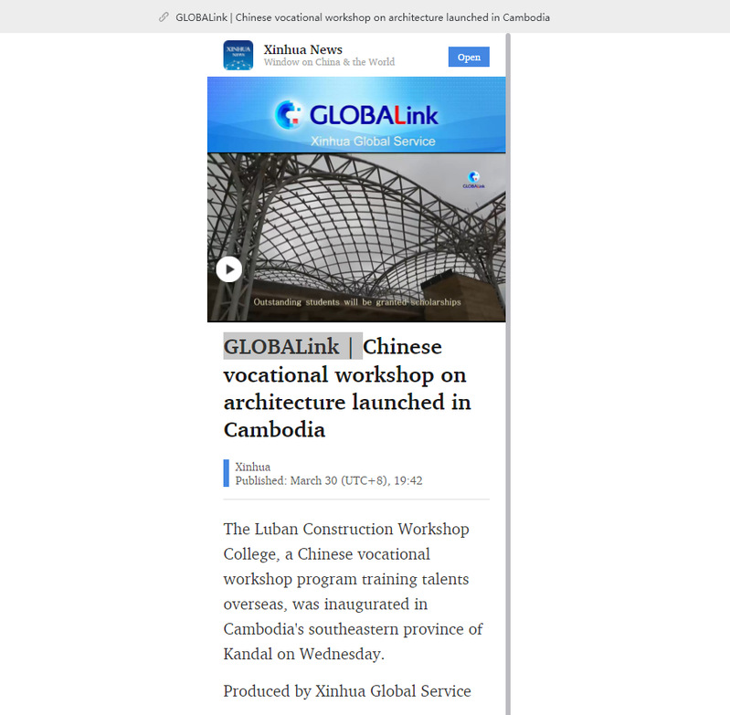 The Luban Construction Workshop College, a Chinese vocational workshop program training talents overseas, was inaugurated in Cambodia's southeastern province of Kandal on Wednesday.