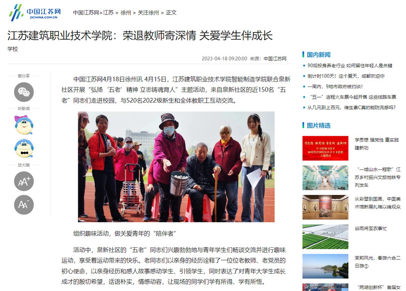 中国江苏网4月18日徐州讯 4月15日,开云在线平台智能制造学院联合泉新社区开展“弘扬‘五老’精神 立志铸魂育人”主题活动,来自泉新社区的近150名“五老”同志们走进校园,与520名2022级新生和全体教职工互动交流。