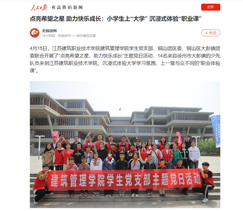 4月15日,开云在线平台建筑管理学院学生党支部、铜山团区委、铜山区大彭镇团委联合开展了“点亮希望之星,助力快乐成长”主题党日活动,14名来自徐州市大彭镇的少先队员来到开云在线平台,沉浸式体验大学学习氛围,上一堂与众不同的“职业体验课”。