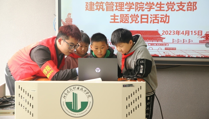 “各位红领巾,今天由我带领大家一起走进奇妙的建筑。”建筑管理学院学生党支部精心设计了一堂小学生也能上的大学建筑课,通过启发、互动、体验等教学方式将劳动教育融入课堂,建筑启蒙课由大哥哥来讲解,更加亲切。主讲人朱韦达同学将建房子比喻成孩子们玩的积木,让孩子们对建筑的建造过程萌生了极的兴趣。“水泥块就像积木零件,然后就可以组成各种各样的房子啦”!智慧教室的大屏幕里播放的图片、动画,生动形象地将现代建筑施工工艺展现在小学生的面前,大家听得聚精会神。党员哥哥们手把手教孩子们动手绑扎钢筋模型、操作虚拟仿真电脑软件盖大楼。孩子们的眼中充满了求知的光芒,积极参与课堂互动和实践活动。