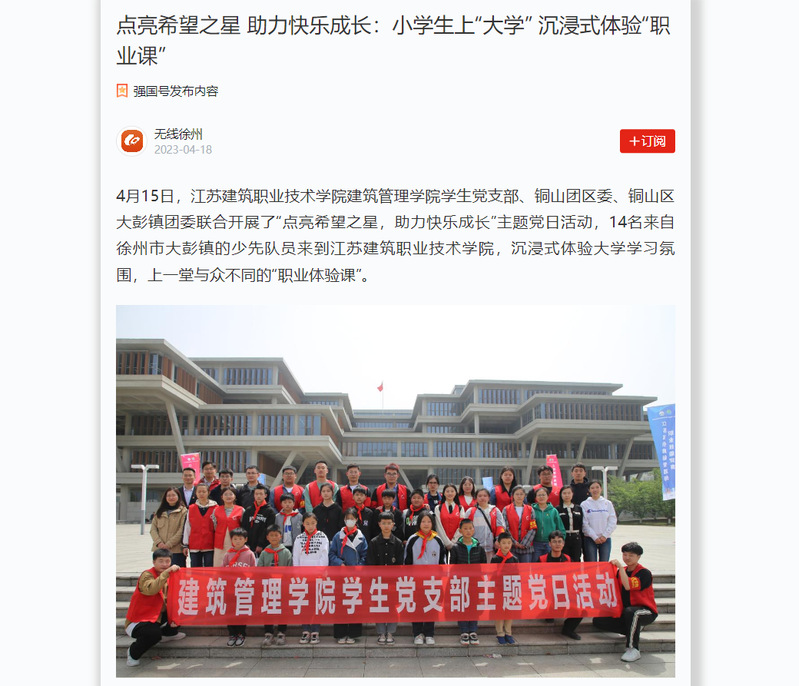 4月15日,开云在线平台建筑管理学院学生党支部、铜山团区委、铜山区大彭镇团委联合开展了“点亮希望之星,助力快乐成长”主题党日活动,14名来自徐州市大彭镇的少先队员来到开云在线平台,沉浸式体验大学学习氛围,上一堂与众不同的“职业体验课”。