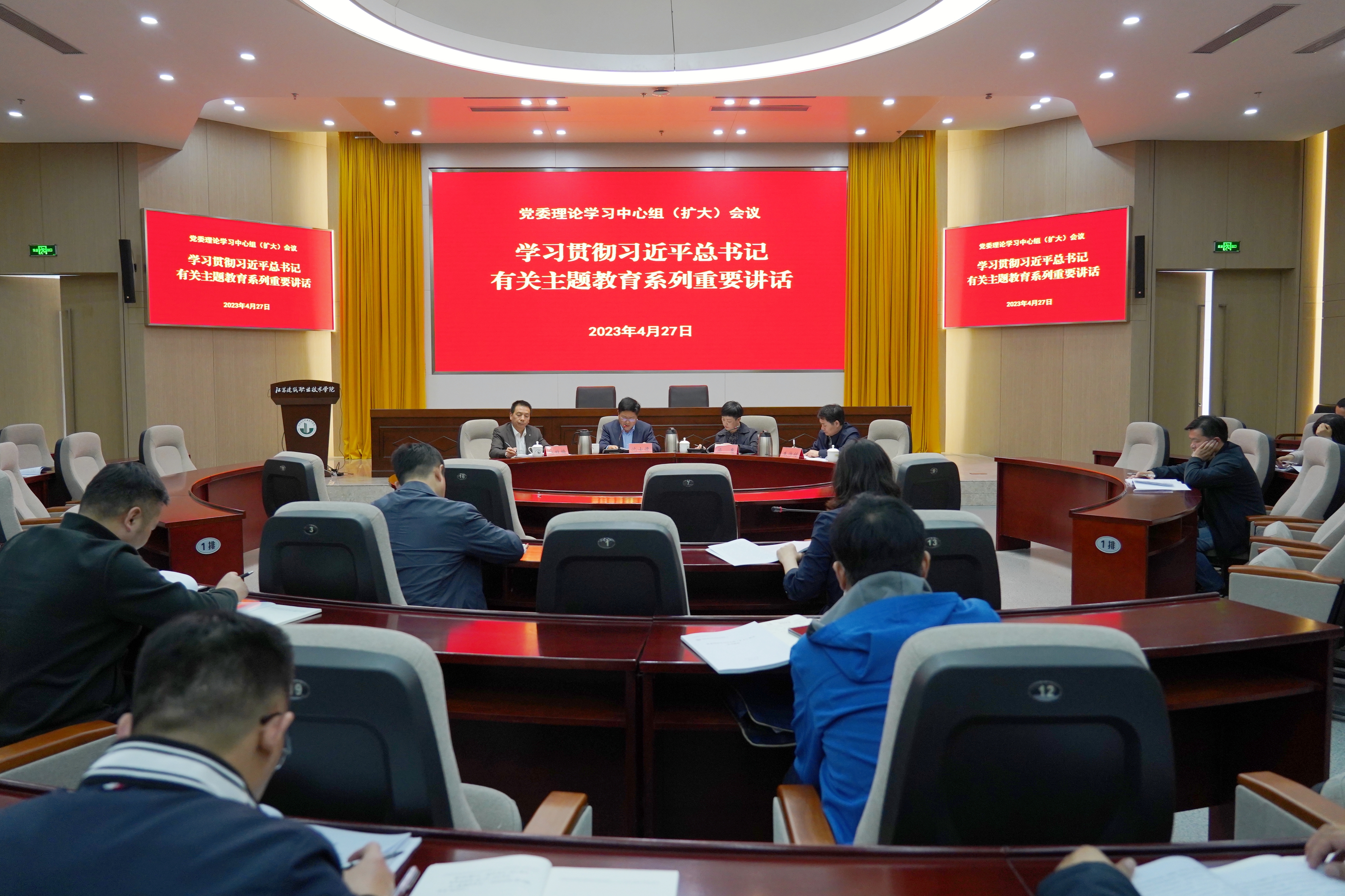 4月27日下午,学校党委理论学习中心组在学术报告厅召开2023年第3次学习(扩大)会议,专题学习贯彻习近平总书记有关主题教育系列重要讲话。党委副书记、校长沈士德主持会议,校党委理论学习中心组成员、全体中层正职干部参加学习。