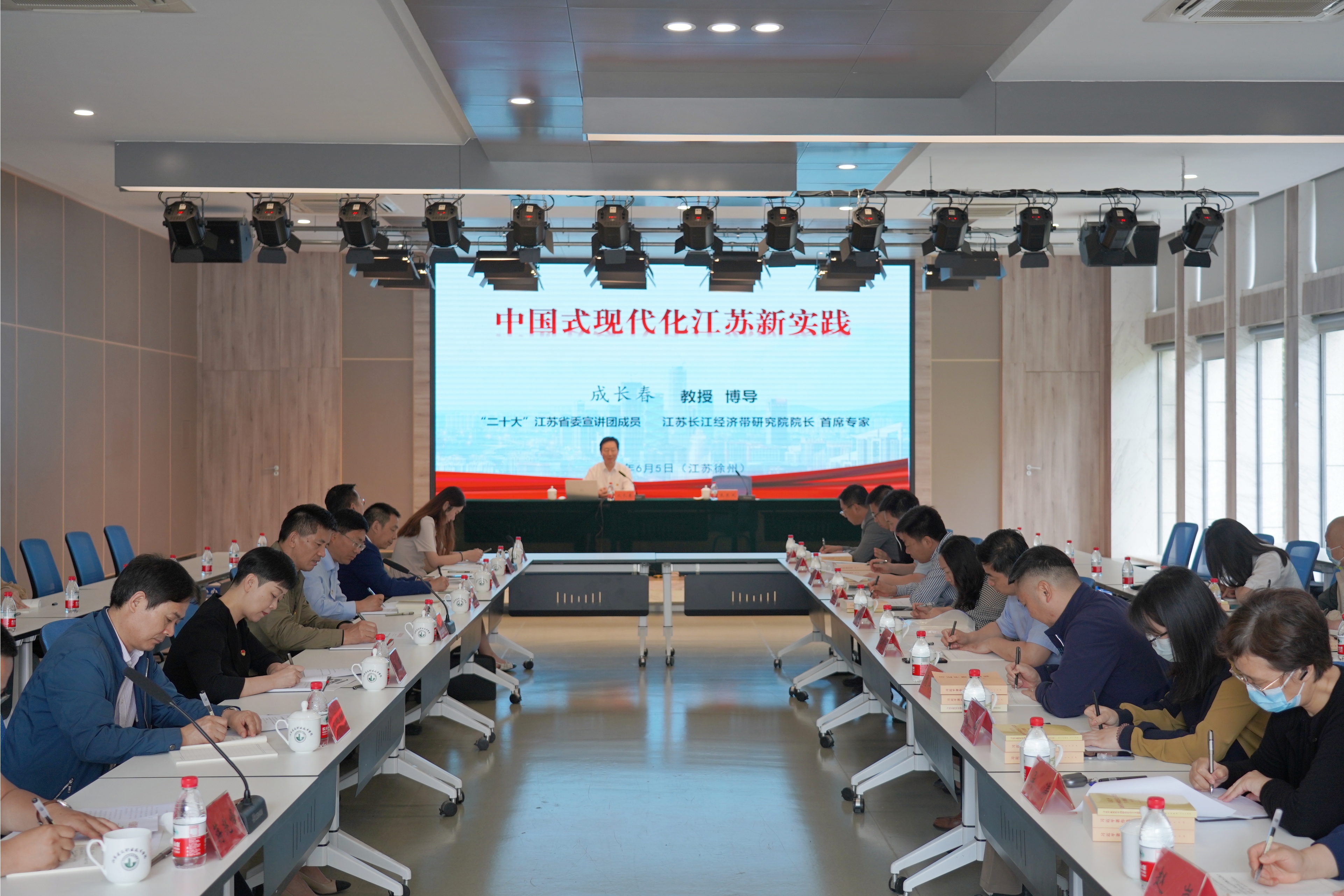 6月5日上午,学校党委召开2023年第7次党委理论中心组学习(扩大)会议暨主题教育专题读书班第7次集中学习辅导。党的二十大江苏省委宣讲团成员,江苏长江经济带研究院院长、首席专家,南通大学原党委书记成长春教授应邀来校,作了题为《中国式现代化江苏新实践》的专题报告。党委书记朱东风主持会议,校党委理论学习中心组成员、马克思主义学院干部教师参加学习。