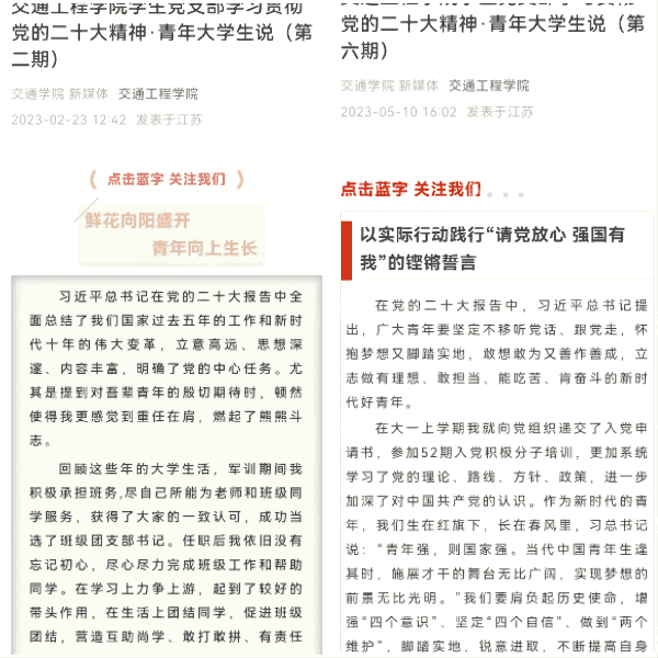 充分利用微信公众号网络新媒体,开设“学习贯彻党的二十大精神 青年大学生说”特色栏目,发挥学生党员骨干的榜样示范作用,带动全体学生主动学习党的二十大精神。
