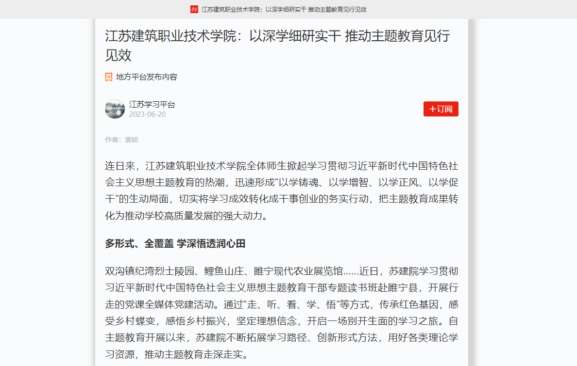 苏建院坚持学思用贯通、知信行统一,注重学用结合、以学促干,把调查研究作为主题教育的重要内容,推动主题教育深入开展、取得实效。