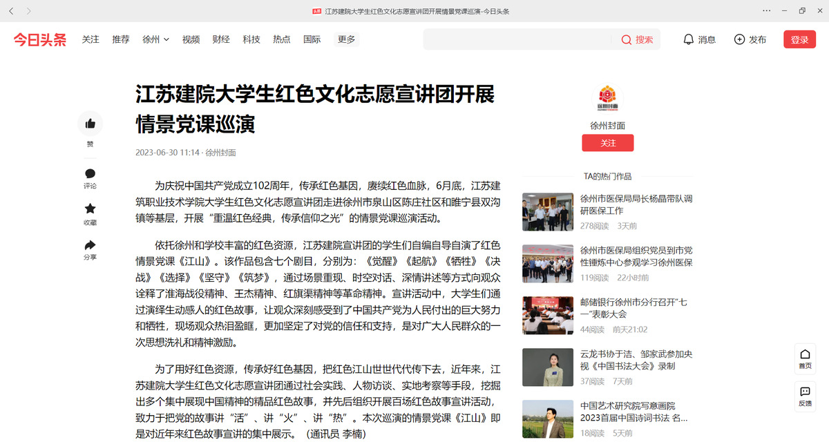 依托徐州和学校丰富的红色资源,江苏建院宣讲团的学生们自编自导自演了红色情景党课《江山》。该作品包含七个剧目,分别为:《觉醒》《起航》《牺牲》《决战》《选择》《坚守》《筑梦》,通过场景重现、时空对话、深情讲述等方式向观众诠释了淮海战役精神、王杰精神、红旗渠精神等革命精神。宣讲活动中,大学生们通过演绎生动感人的红色故事,让观众深刻感受到了中国共产党为人民付出的巨大努力和牺牲,现场观众热泪盈眶,更加坚定了对党的信任和支持,是对广大人民群众的一次思想洗礼和精神激励。