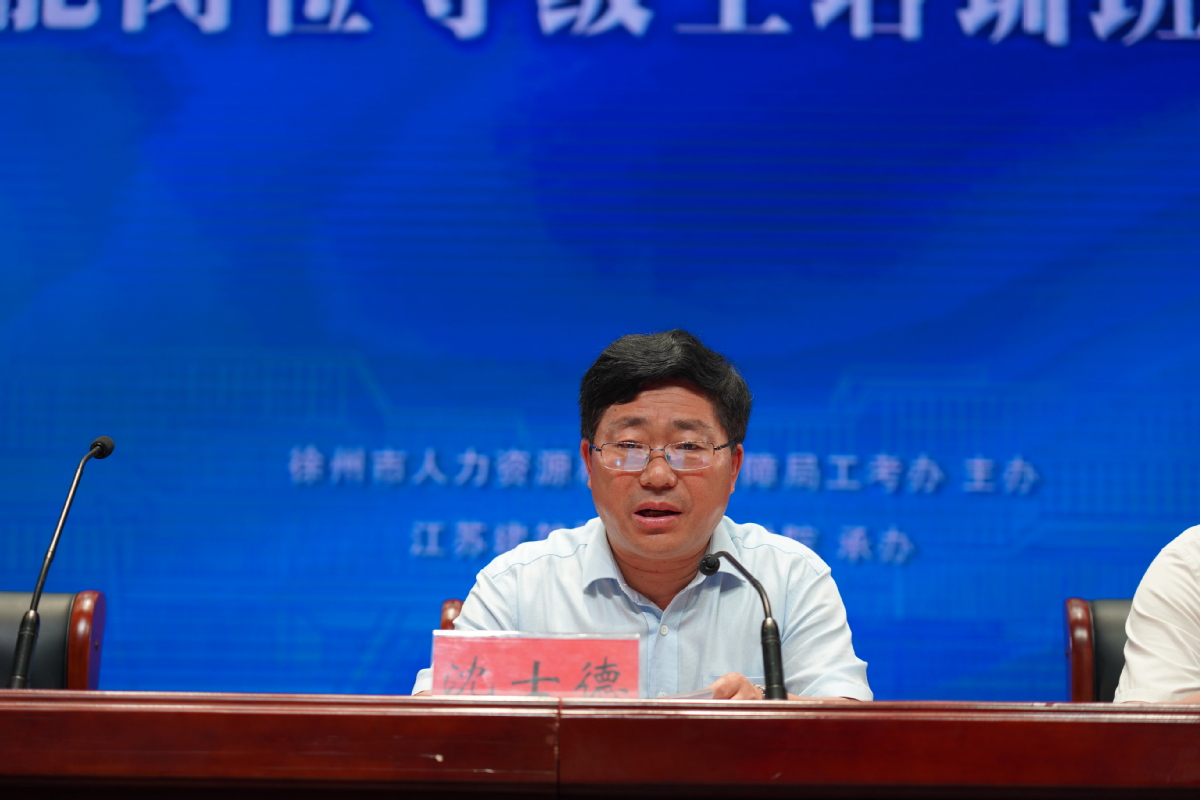 7月7日,2023年徐州市机关事业单位工勤技能岗位等级工培训开班仪式在我校会堂举行,党委副书记、校长沈士德,徐州市人力资源和社会保障局副局长苗斌、工考办主任陈苏南及校实验实训管理处相关负责人出席开班仪式。