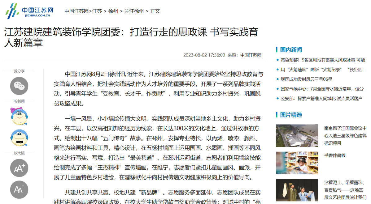 中国江苏网8月2日徐州讯 近年来,江苏建院建筑装饰学院团委始终坚持思政教育与实践育人相结合,把社会实践活动作为人才培养的重要手段,开展了一系列品牌实践活动,引导青年学生“受教育、长才干、作贡献”,利用专业知识助力乡村振兴,巩固脱贫攻坚成果。