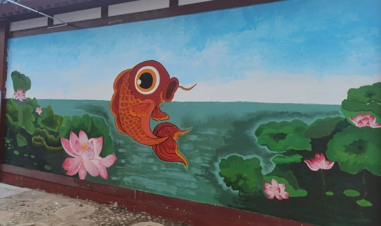 终于,在团队成员的共同努力下,以“锦鲤荷韵”“农耕秋收”和“田园风光”为主题的三面彩绘跃然墙上。团队成员们用柔和的色彩和细腻的笔触,将当地文化、产业特色、自然风光融合于画笔之间,完成三面将近100多平米的墙绘创作。