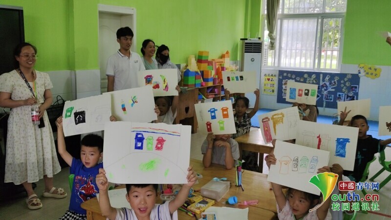 图为小朋友们展示绘制的分类垃圾桶。中国青年网通讯员 董钰欣 供图