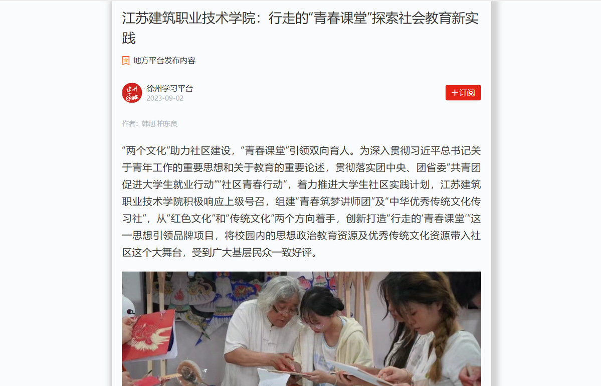 “行走的‘青春课堂’”这一品牌项目已开展一年有余,其间,开云在线平台“青春筑梦讲师团”“中华优秀传统文化传习社”两支队伍来自不同专业的百余位青年教师和学生,针对徐州市不同类型社区的人员构成情况,创新社区教育实践方式,积极探索“演”“讲”“做”“唱”“舞”等多位一体的授课形式,将形式多样、内容丰富的“行走的‘青春课堂’”先后带入徐州九里新苑社区、泉新社区、南苑社区等18个社区,累计授课50余场,覆盖社区居民20000余人次,真正做到将高校青年的思想引领工作、中华优秀传统文化资源挖掘传承工作与社区教育工作有机结合,把青年学子自身的学习成果转化为校地双向育人的实际成效,让高校的丰富教育资源更好地作用于社区民众。