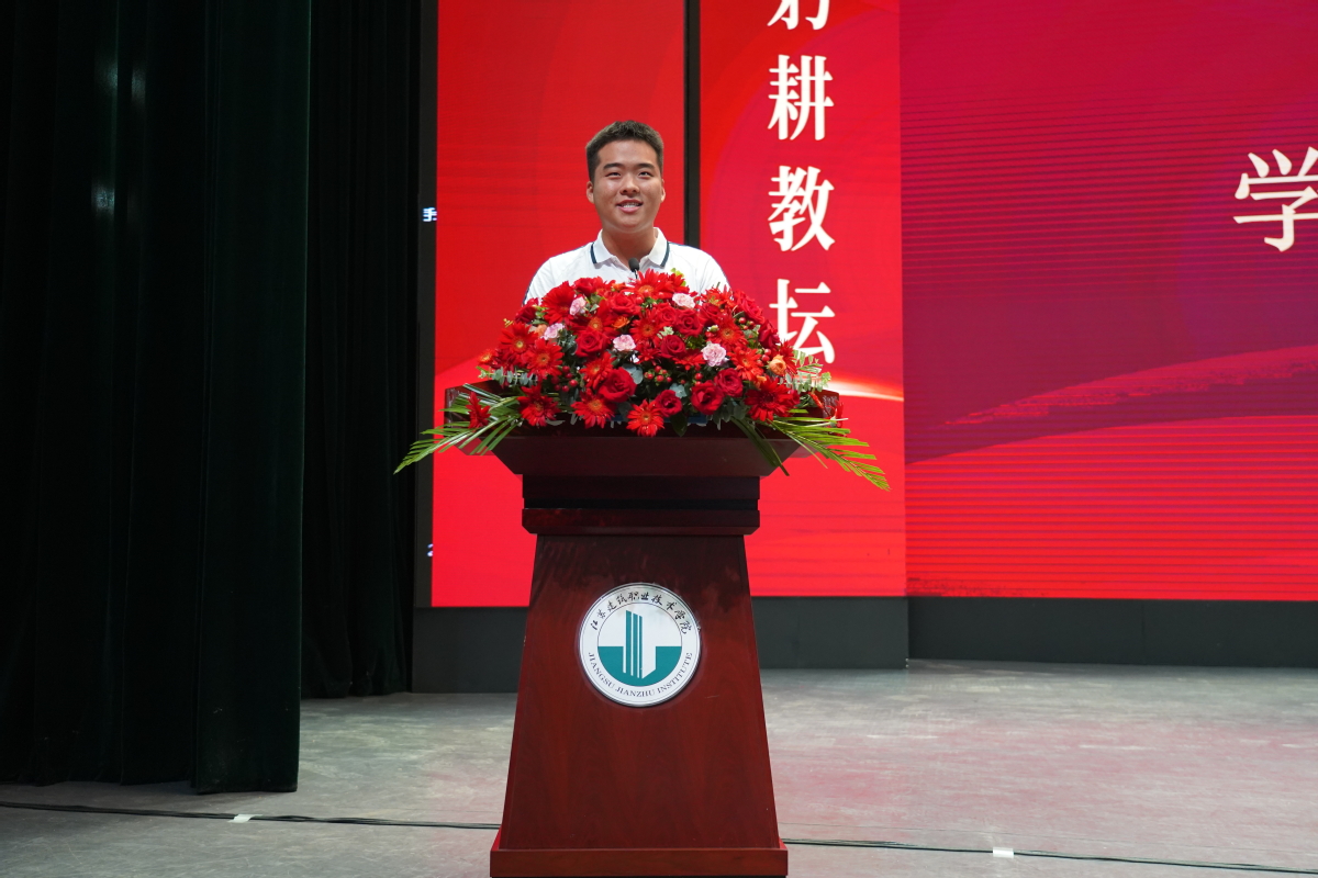 大会现场,46名新入职教师在江苏省教学名师孙韬的带领下进行了庄严的入职宣誓。建筑智能学院教师张丽娟作为优秀教师代表进行了工作经验分享。建筑装饰学院室设22-2班孙壮壮代表学生发言。