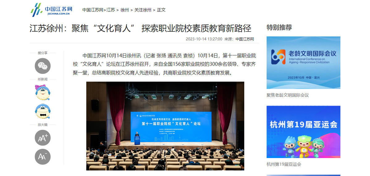 中国江苏网10月14日徐州讯(记者 张扬 通讯员 袁祯)10月14日,第十一届职业院校“文化育人”论坛在江苏徐州召开,来自全国156家职业院校的300余名领导、专家齐聚一堂,总结高职院校文化育人先进经验,共商职业院校文化素质教育发展。