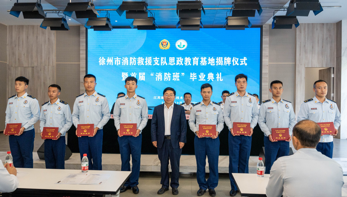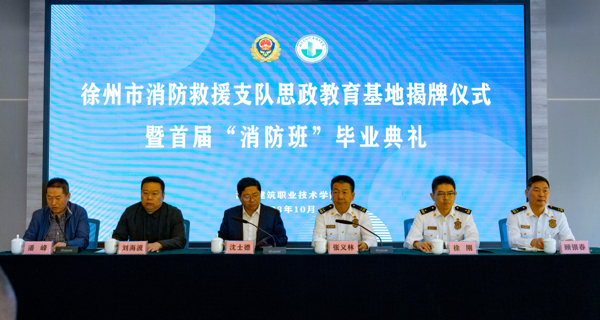 10月17日,徐州市消防救援支队思政教育基地揭牌仪式暨首届“消防班”毕业典礼在我校举行。党委副书记、校长沈士德,党委委员、副校长刘海波,徐州市消防救援支队政治委员张义林、政治部主任徐刚、一级督导员顾银春,首届“消防班”毕业生以及相关部门负责人参加此次活动。继续教育学院院长潘峰主持此次活动。