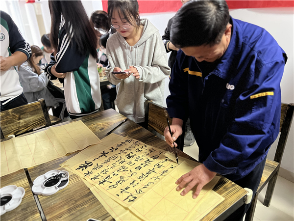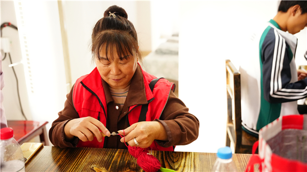 除了文艺表演之外,活动现场还安排了系列传统文化体验活动。志愿者们和老人们一起搭建古建筑模型、体验插花技艺、一起编织手工品、进行书法绘画。花艺社社团郭建雨同学用通俗易懂的语言从花卉的选择、颜色的搭配、花枝长短的修剪以及如何让花卉错落有致等方面进行了讲解。接着,大家修剪枝叶,巧妙搭配,一束束生机盎然的插花作品呈现在眼前,看着自己亲手制作的作品,老人们忍不住互相拍照留影。针织社社团刘娟同学给参与活动的老人们分发毛线和棒针等工具,并耐心讲解编制技巧,老人们兴致盎然,纷纷动手体验,郁金香、向日葵、鸡冠花等作品的雏形渐渐呈现出来。