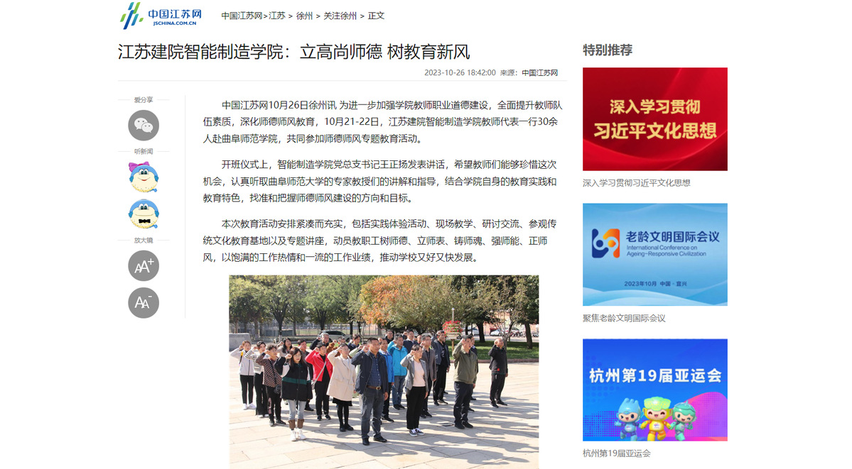 中国江苏网10月26日徐州讯 为进一步加强学院教师职业道德建设,全面提升教师队伍素质,深化师德师风教育,10月21-22日,江苏建院智能制造学院教师代表一行30余人赴曲阜师范学院,共同参加师德师风专题教育活动。