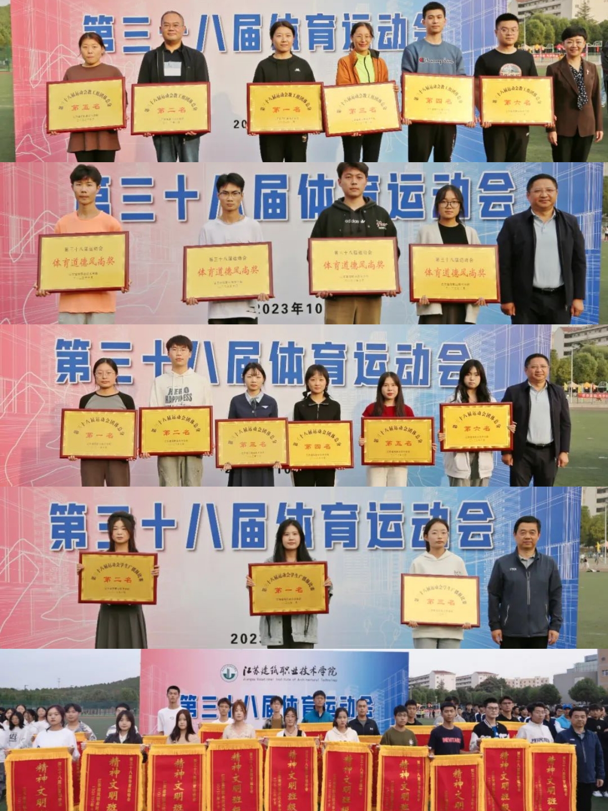 闭幕式上,梁惠、蒋兆峰等领导还代表组委会为获得教工组团体总分前六名、学生组团体总分前六名、体育道德风尚奖、学生广播操比赛团体前三名、精神文明奖的单位颁发了奖牌、锦旗。