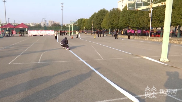演练的重头戏,是消防水带接力和灭火接力两项竞赛。比赛分学生组和教职工组。消防水带接力,需要将消防水带叠好后再快速展开,这项技能虽然看似不起眼,但如果水带缠绕在一起,灭火时就无法提供足够的水压。