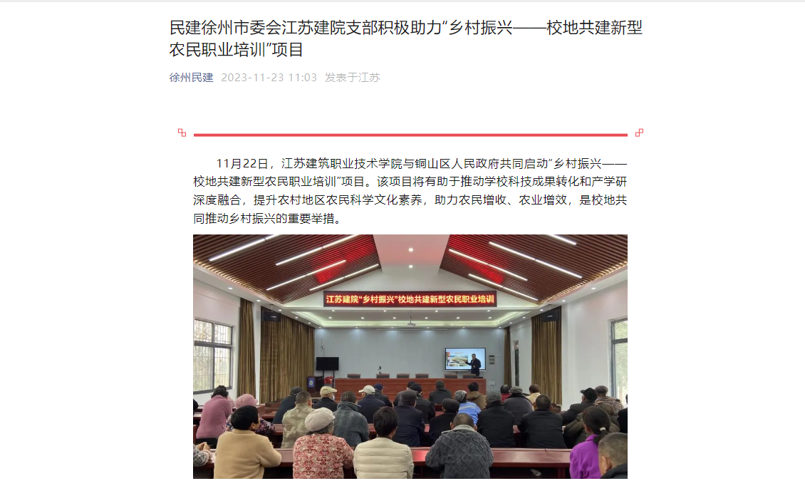 民建江苏建院支部全体会员将根据学校的统一部署,结合铜山区乡村产业发展实际、人员知识结构,发挥自身专业优势,参与到面向生产经营型、专业技能型、专业服务型三类群体开展专业知识、技术技能方面的培训之中,积极助力“乡村振兴——校地共建新型农民职业培训”项目。