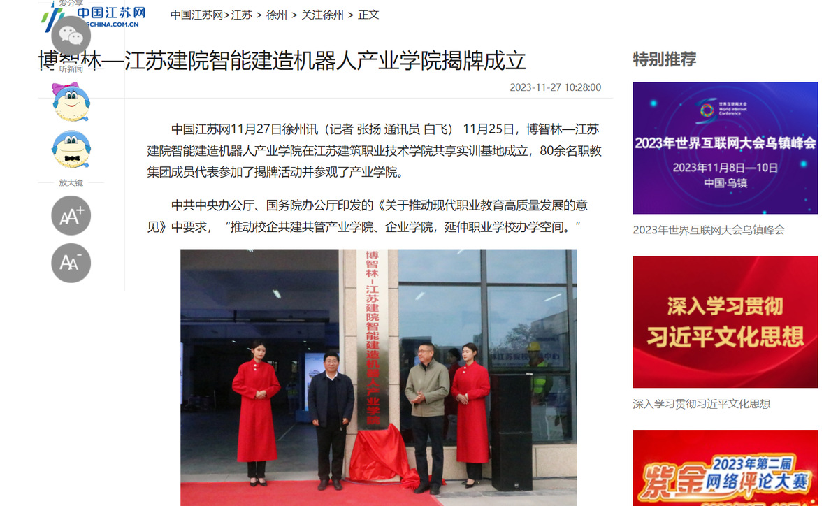 同时,校企成立“博智林江苏院校支持中心”,为江苏院校开展建筑机器人领域相关的实训、教学提供支持,也为淮海经济区建筑类企业及职业院校提供产品开发设计、智能机器人运用服务,为集团中有需要的企业和院校提供建筑智能机器人使用、操作、实验、实习等各项服务,实现资源共享、合作发展,在合作中创新,在共赢中发展。