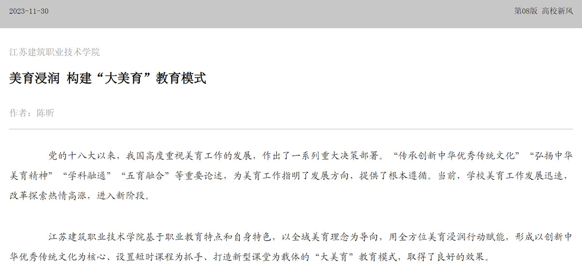 开云在线平台基于职业教育特点和自身特色,以全域美育理念为导向,用全方位美育浸润行动赋能,形成以创新中华优秀传统文化为核心、设置短时课程为抓手、打造新型课堂为载体的“大美育”教育模式,取得了良好的效果。