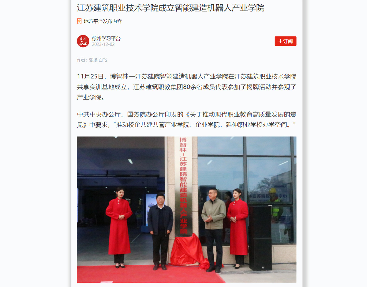 同时,校企成立“博智林江苏院校支持中心”,为江苏院校开展建筑机器人领域相关的实训、教学提供支持,也为淮海经济区建筑类企业及职业院校提供产品开发设计、智能机器人运用服务,为集团中有需要的企业和院校提供建筑智能机器人使用、操作、实习等各项服务,实现资源共享、合作发展,在合作中创新,在共赢中发展。