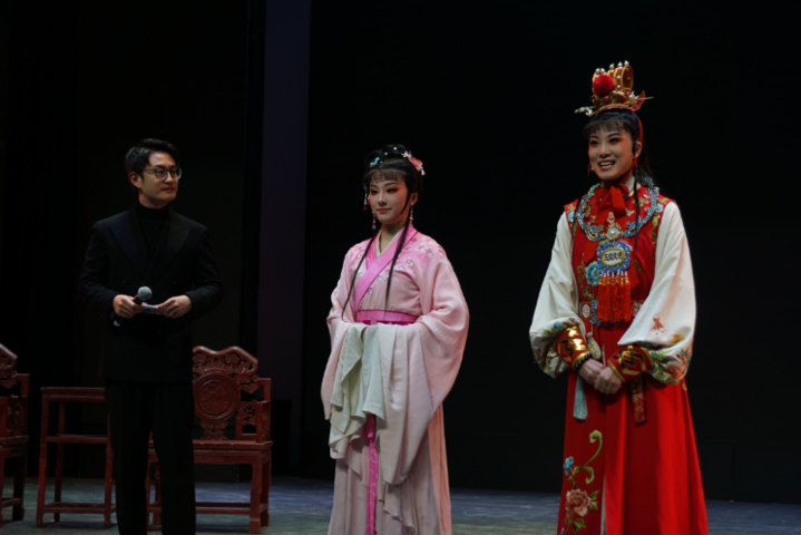 在开演前,江苏文艺广播主持人一潇为同学们进行剧目导赏,扮演“贾宝玉”的吉飞和扮演“林黛玉”的章琪上台,向同学们展现了新一代越剧演员的青春风采,并带领同学们互动。