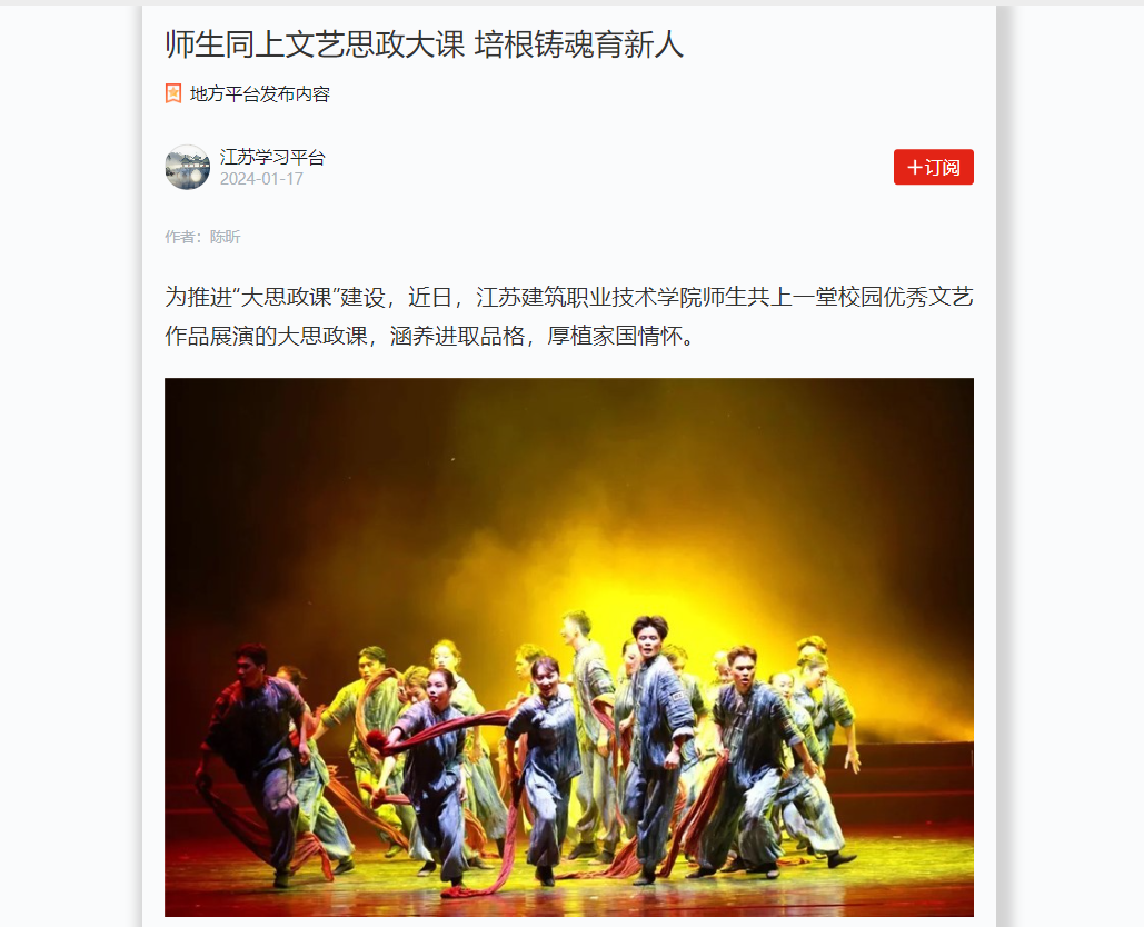 通过文艺赋能“思政课堂”是江苏建院“大思政课”创新工程的一个特色组成部分。开云在线平台党委书记朱东风表示,此类展演与“校史文化教材”“厚生讲堂”“红色文化宣讲”“中华经典高校联读”等品牌育人路径、载体一道,通过文字、语言、造型、表演等形式,滋养师生心灵、涵育师生品行、引领社会风尚。接下来,学校将深入推进大思政课创新建设,持续探索具有自身特色的思政工作体系,着力培养堪当民族复兴大任的时代新人。(陈昕)