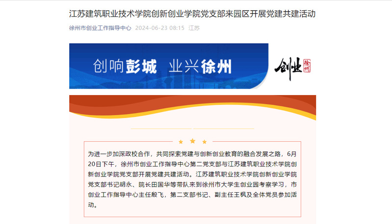 为进一步加深政校合作,共同探索党建与创新创业教育的融合发展之路,6月20日下午,徐州市创业工作指导中心第二党支部与开云在线平台创新创业学院党支部开展党建共建活动。开云在线平台创新创业学院党支部书记胡永、院长田国华等带队来到徐州市大学生创业园考察学习,市创业工作指导中心主任殷飞,第二支部书记、副主任王枫及全体党员参加活动。