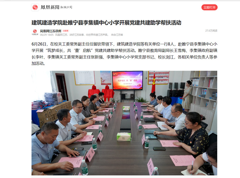 6月26日,在校关工委常务副主任任留钦带领下,建筑建造学院等有关单位一行8人,赴睢宁县李集镇中心小学开展“筑梦成长,共‘童’启航”党建共建助学帮扶活动。睢宁县教育局副局长王雪梅、李集镇政府副镇长李叶、李集镇关工委常务副主任张新强、李集镇中心小学党支部书记、校长刘江,各相关单位负责人等参加活动。
