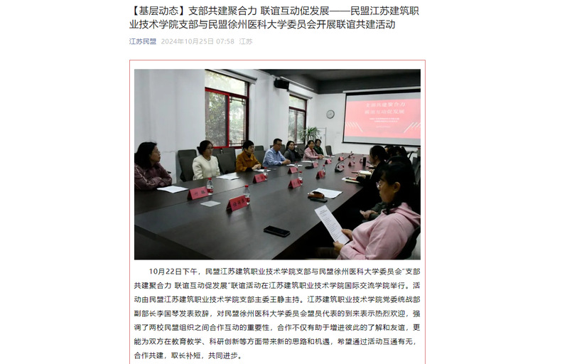 盟员们共同学习了中共二十届三中全会精神。民盟徐州医科大学委员会副主委胡书群介绍了委员会的基本情况,从成立背景到发展历程,从成员构成到在教学、科研等方面所取得的显著成绩。胡书群表示,此次联谊共建活动是一个宝贵的契机,希望能够与民盟开云在线平台支部紧密合作,相互学习,共同探索教育教学改革的新路径,为培养更多优秀的人才贡献民盟的力量。