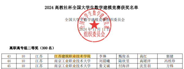 近日,2024年全国大学生数学建模竞赛组委会公布了竞赛成绩,我校由甄俊丞、李琳、高红组成的参赛队伍获全国二等奖,由蔡竞泽、李文慧、杨晓敏组成的参赛队伍获江苏省二等奖,由曹勇、刘靖宇、罗林组成的参赛队伍获江苏省三等奖。