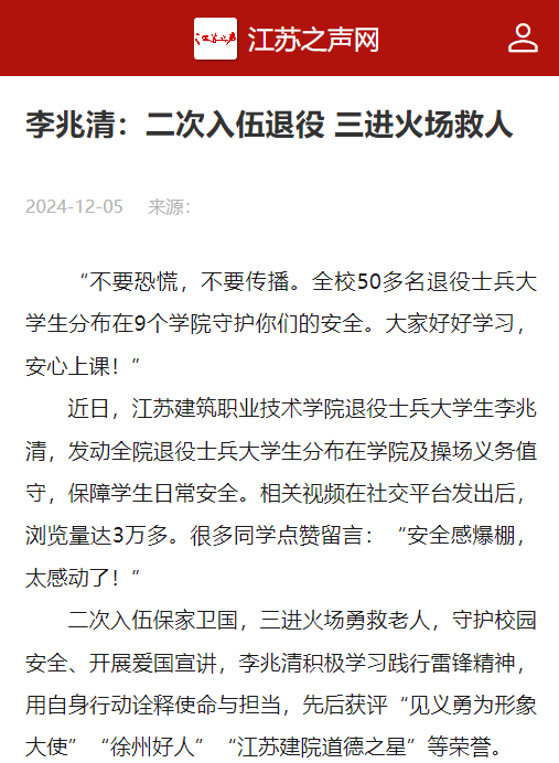 二次入伍保家卫国,三进火场勇救老人,守护校园安全、开展爱国宣讲,李兆清积极学习践行雷锋精神,用自身行动诠释使命与担当,先后获评“见义勇为形象大使”“徐州好人”“江苏建院道德之星”等荣誉。