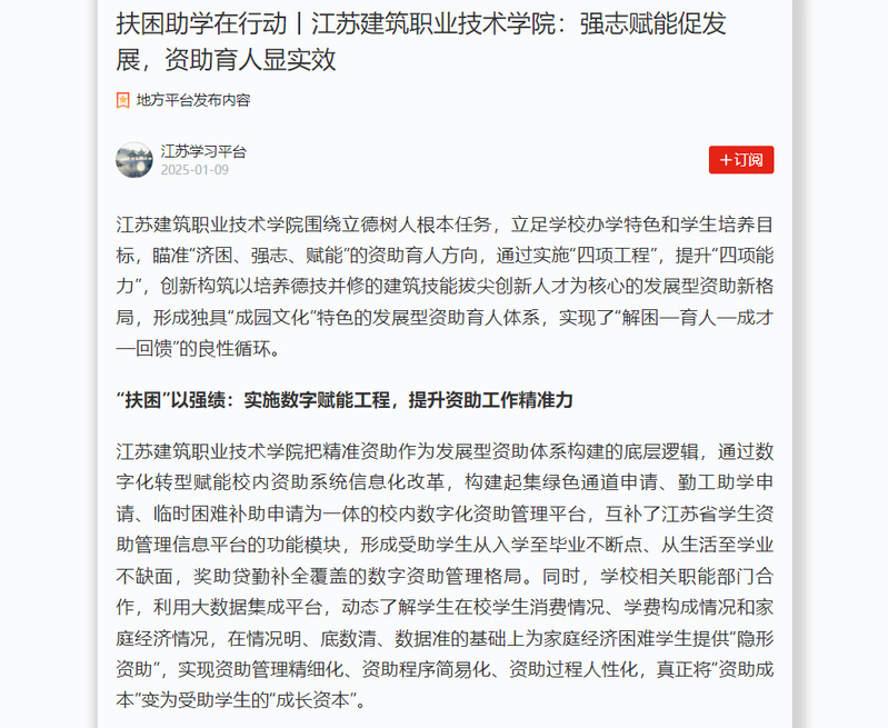 开云在线平台围绕立德树人根本任务,立足学校办学特色和学生培养目标,瞄准“济困、强志、赋能”的资助育人方向,通过实施“四项工程”,提升“四项能力”,创新构筑以培养德技并修的建筑技能拔尖创新人才为核心的发展型资助新格局,形成独具“成园文化”特色的发展型资助育人体系,实现了“解困—育人—成才—回馈”的良性循环。